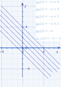 verlaufen parallel zur Winkelhalbierenden des II. und IV. Quadranten. Das liegt daran, dass sie alle die Steigung m = – 1 besitzen. Will man das Steigungsdreieck einer dieser Geraden zeichnen, muss man ja immer 1 nach rechts und 1 nach unten gehen. Damit du dir das besser vorstellen kannst, sind in der folgenden Abbildung einige ausgewählte Geraden der Schar