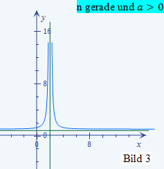 Das Vorzeichen von a ist positiv und die Potenz n des Nenners ist gerade. Daher ähnelt der Verlauf des Graphen von f(x) dem in Bild 3 (aus Bsp. 1) gezeigten Graphen.