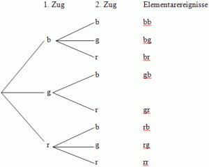 Beachte, dass ohne Zurücklegen gezogen wird! Das hat zur Folge, dass jede Kugel nur einmal gezogen werden kann. Hat man beispielsweise die einzige gelbe Kugel beim ersten Zug schon gezogen, kann sie beim zweiten Zug nicht mehr gezogen werden. Deshalb dürfen im Baumdiagramm von g ausgehend nur zwei Pfade gezeichnet werden, nämlich der zu b und zu r. (Vergleiche erstes Baumdiagramm Bereich unten Mitte bzw. im zweiten Baumdiagramm Mitte hinten!) Dagegen gehen von b und von r jeweils drei Äste weg. Da sowohl von den blauen Kugeln als auch von den roten Kugeln ursprünglich mehr als eine in der Urne waren, kann beim zweiten Zug noch einmal eine blaue bzw. eine rote Kugel kommen. In anderen Worten:Es gibt zwar die beiden Fälle bb und rr, aber nicht gg. (Hätte man mit Zurücklegen gezogen, hätte auch der Fall gg existiert. Dann wären auch von g drei Äste weggegangen.)